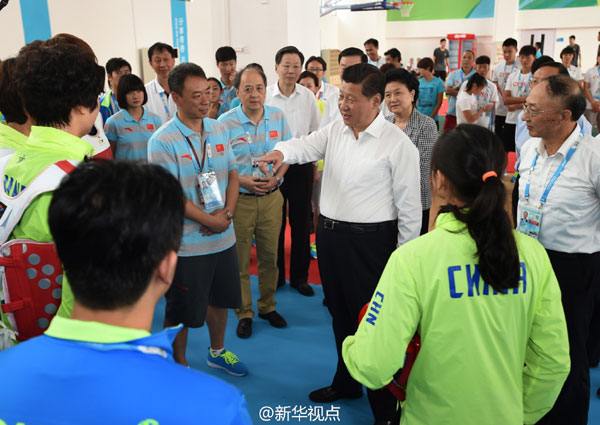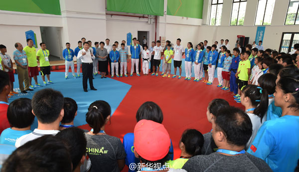 ????新華網(wǎng)北京8月15日電? 據(jù)新華視點微博報道,第二屆夏季青奧會開幕前夕,習近平總書記15日下午來到青奧會運動員村,親切看望中國體育代表團,代表黨中央、國務院、全國各族人民,向全體運動員、教練員、工作人員和志愿者致以誠摯問候,勉勵大家努力踐行“分享青春,共筑未來”的南京青奧會理念。