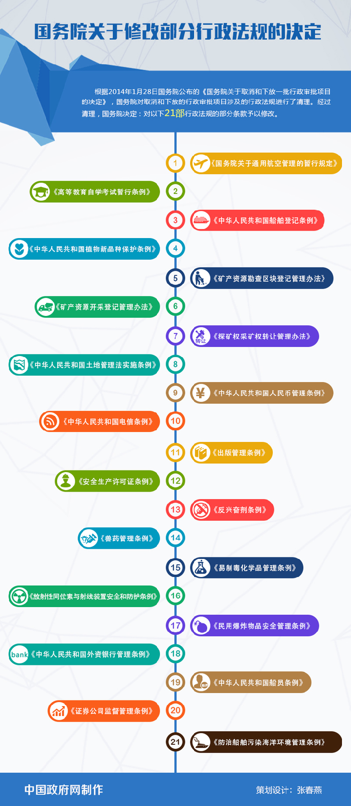 ????為了依法推進行政審批制度改革和政府職能轉(zhuǎn)變,發(fā)揮好地方政府貼近基層的優(yōu)勢,促進和保障政府管理由事前審批更多地轉(zhuǎn)為事中事后監(jiān)管,進一步激發(fā)市場活力、發(fā)展動力和社會創(chuàng)造力,根據(jù)2014年1月28日國務(wù)院公布的《國務(wù)院關(guān)于取消和下放一批行政審批項目的決定》,國務(wù)院對取消和下放的行政審批項目涉及的行政法規(guī)進行了清理。經(jīng)過清理,國務(wù)院決定:對21部行政法規(guī)的部分條款予以修改。