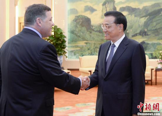 ????8月16日,中國(guó)國(guó)務(wù)院總理李克強(qiáng)在北京人民大會(huì)堂會(huì)見美國(guó)國(guó)會(huì)眾議員舒斯特率領(lǐng)的議員代表團(tuán),并同他們進(jìn)行對(duì)話交流。中新社發(fā) 劉震 攝??