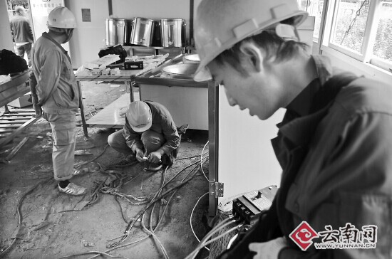 ????在學(xué)校一間板房內(nèi),蒸飯車、土豆切皮機(jī)、冰柜、消毒柜、切菜及絞切肉機(jī),甚至還有不銹鋼工作臺,一應(yīng)俱全。工人們蹲在電磁灶旁邊一遍一遍調(diào)試著電路。孩子們趴在窗口看著這些閃著光的大機(jī)器,充滿了好奇。據(jù)了解,這些炊具是從湖北運(yùn)來的,價(jià)格10萬元。由于震區(qū)電力受損,青基會(huì)專門為學(xué)校配備了380伏的發(fā)動(dòng)機(jī)以保證機(jī)器的正常使用。青基會(huì)“希望廚房”負(fù)責(zé)人黃周明說,在地震前,學(xué)校用的是土灶,師生吃飯都不容易。“熱得快又是全自動(dòng),以后,只需要三四名老師就可以保證全校師生的用餐問題?!?/p>