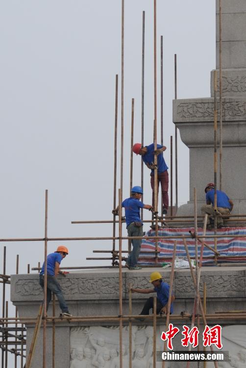 ????2014年8月29日,北京天安門廣場,工人開始在人民英雄紀(jì)念碑周圍搭建腳手架,準(zhǔn)備對其進(jìn)行整體的清洗工作,迎接建國65周年國慶的到來。中新社發(fā) 玉龍 攝 圖片來源:CNSPHOTO