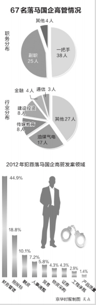 京華時報記者統(tǒng)計(jì)發(fā)現(xiàn),十八大以來,國企系統(tǒng)因各類違紀(jì)而“落馬”的高管已有67人,其中擔(dān)任所在公司或集團(tuán)一把手職務(wù)的有38人,如華潤集團(tuán)董事長、黨委書記宋林等;擔(dān)任副職的有25人,如中國移動通信集團(tuán)公司原副總經(jīng)理、中國移動(香港)有限公司董事兼副總經(jīng)理魯向東,中國遠(yuǎn)洋運(yùn)輸(集團(tuán))總公司原黨組成員、副總經(jīng)理徐敏杰等;其余4人雖非企業(yè)掌舵人,但也身居要職或“肥缺”,如福建省煙草公司原黨組成員、紀(jì)檢組長孫佳和,陜西有色光電科技有限公司工程部部長、寶鈦集團(tuán)原技改辦副主任李周岐等。