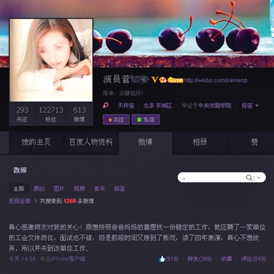 “原想按照爸爸媽媽的意愿找一份穩(wěn)定的工作,就應聘了一家單位的工會文體崗位,面試也不錯,但是前段時間又接到了新戲,讀了四年表演,真心不想放棄。所以并未到該單位工作?!弊蛉障挛?時54分,菅某發(fā)微博回應稱,確已通過北方車輛研究所文體崗位初試,但因不愿放棄表演,因而未入職。