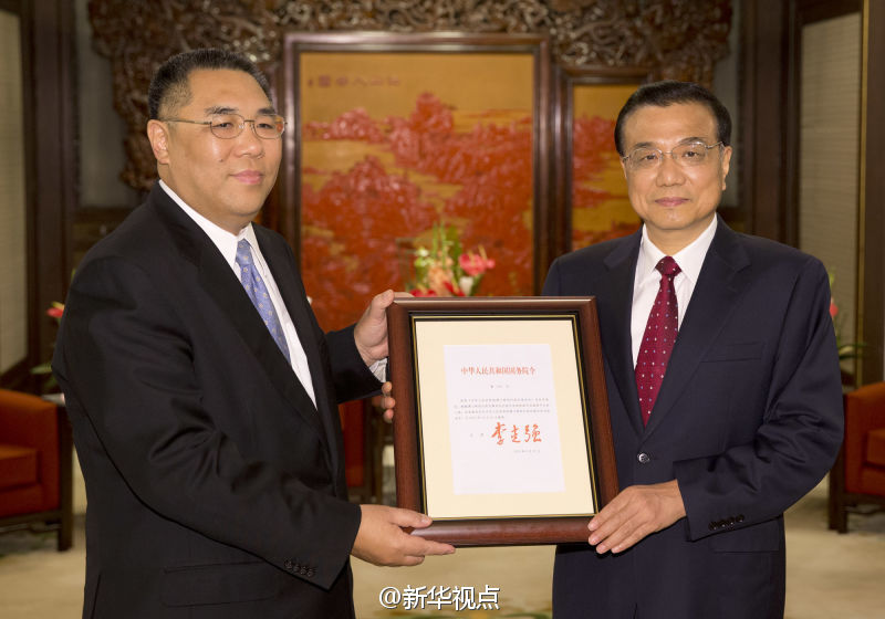 ????新華網(wǎng)北京9月22日電 據(jù)新華社“新華視點(diǎn)”微博報(bào)道,9月22日上午,國務(wù)院總理李克強(qiáng)在中南海紫光閣會(huì)見來京接受任命的澳門特別行政區(qū)行政長(zhǎng)官崔世安,并頒發(fā)任命崔世安為中華人民共和國澳門特別行政區(qū)第四任行政長(zhǎng)官的第655號(hào)國務(wù)院令。