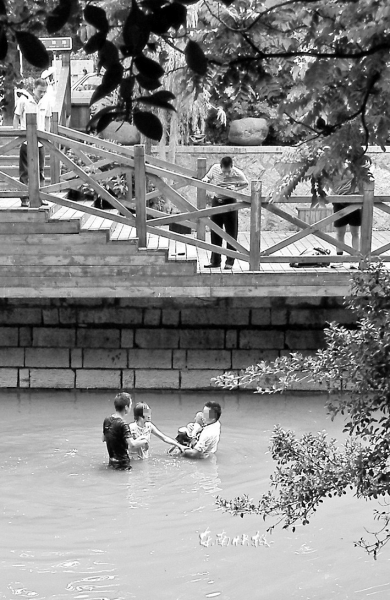據(jù)林召銀介紹,那名黑衣男子將手機(jī)等物品一扔,衣服都沒脫,就縱身跳入水中,先將男嬰救起。在周邊群眾明確表示河水不深之后,男嬰的父親也下了水,從黑衣男子的手中接過小孩,兩人一起把小孩送到駁岸邊,遞給在岸邊守候的路人。