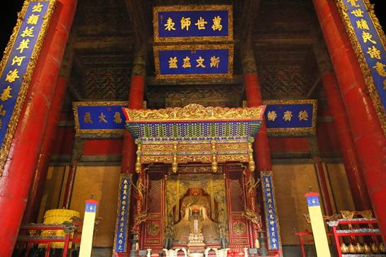 ????孔廟大成殿內(nèi)孔子塑像。此塑像為1982年重塑,基本恢復(fù)雍正八年的孔子形象。像坐高3.35米,頭戴十二旒冠冕,身穿十二章王服,手捧鎮(zhèn)圭。十二冕旒、十二章服,都是《周禮》規(guī)定的古代帝王的穿戴??梢姾笕耸前凑仗熳又苼沓绶羁鬃拥?。在孔廟中除了孔子塑像外,還供奉著“四配”、“十二哲”等配享人物。