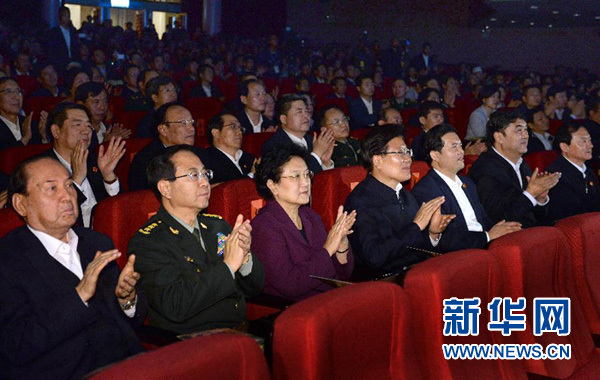 劉延?xùn)|率中央代表團(tuán)觀看慶祝新疆生產(chǎn)建設(shè)兵團(tuán)成立60周年文藝演出