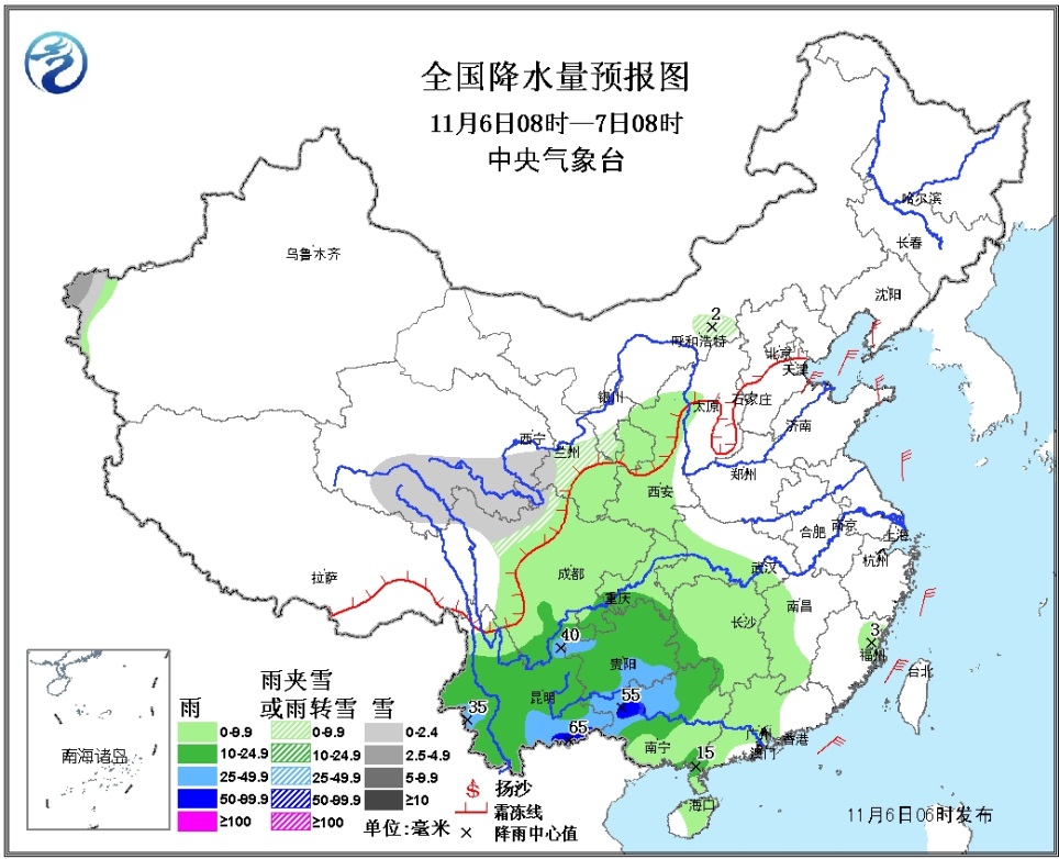 6日08時(shí)至7日08時(shí),新疆西南部、青海東部、川西高原北部等地的部分地區(qū)有小到中雪或雨夾雪;西南地區(qū)大部、江漢西部、江南中西部、華南大部等地有小到中雨,其中,云南南部和東北部、廣西北部、貴州南部等地的部分地區(qū)有大雨,局部地區(qū)有暴雨(50~65毫米)。內(nèi)蒙古東部、東北地區(qū)中南部、華北南部、黃淮北部等地有4~6級(jí)風(fēng)。渤海、黃海中北部有6~7級(jí)、陣風(fēng)8級(jí)的東北風(fēng)。