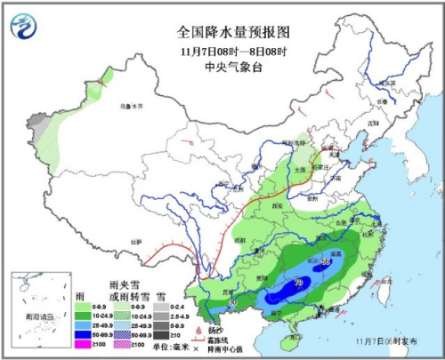 據悉,7日08時至8日08時,新疆西部、山西北部等地有小到中雪或雨夾雪;江淮西南部、江南中西部、華南北部和西部、貴州東部和南部、云南南部等地的部分地區(qū)有中到大雨,局地有暴雨(50~70毫米)。內蒙古東南部、新疆西部等地有4~6級風。臺灣海峽、南海東北部和中東部有6~7級、陣風8級的東北風。