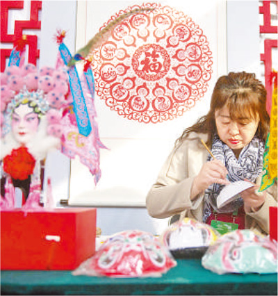 APEC領(lǐng)導(dǎo)人會議周期間,民間藝術(shù)家在國家會議中心“品味北京”展區(qū)演示臉譜繪制藝術(shù)。新華社記者羅曉光攝