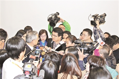 在太平洋經(jīng)濟(jì)合作理事會新聞吹風(fēng)會后,各路記者爭相進(jìn)行補(bǔ)充采訪。本報記者劉剛攝