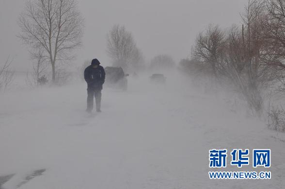 ????12月1日,在黑龍江省黑河市五大連池風(fēng)景區(qū)公路上,行人和車輛在風(fēng)雪中艱難前行 。 新華社發(fā)(陸文祥 攝)