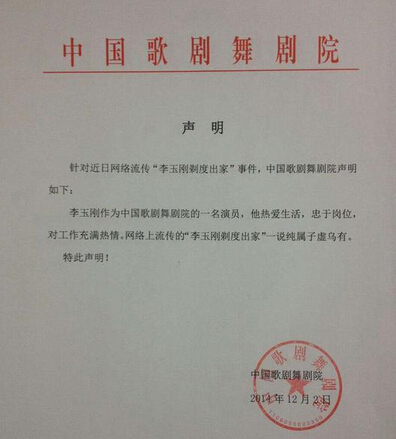 同事,中國歌劇舞劇院也對此次“出家”謠傳發(fā)出鄭重聲明:“作為中國歌劇舞劇院的一名演員,李玉剛熱愛生活,忠于崗位,對工作充滿激情。網(wǎng)絡(luò)上流傳的‘李玉剛剃度出家’一說純屬子虛烏有?!?/p>