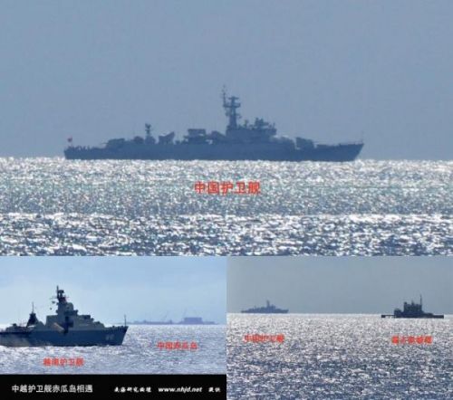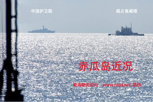 ????(南海研究論壇供圖)圖中可以看見我赤瓜礁上正在建設(shè)的大樓,說明拍照時間在一周以內(nèi)。圖中的越南護(hù)衛(wèi)艦是越海軍“丁先皇”號艦,中國護(hù)衛(wèi)艦可能是537“滄州”艦(053H2型)