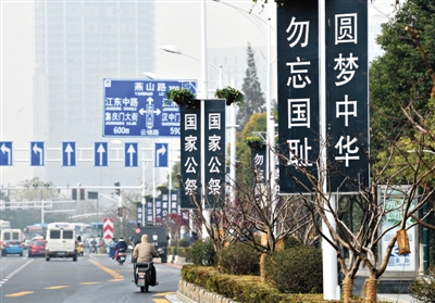 昨日,侵華日軍南京大屠殺遇難同胞紀(jì)念館建筑及附近道路上,布置了國家公祭日的主題標(biāo)語牌。新華社記者孫參攝