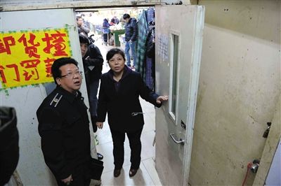 ????2日,天客隆超市,市安監(jiān)局執(zhí)法人員正檢查超市安全出口。新京報(bào)記者 周崗峰 攝