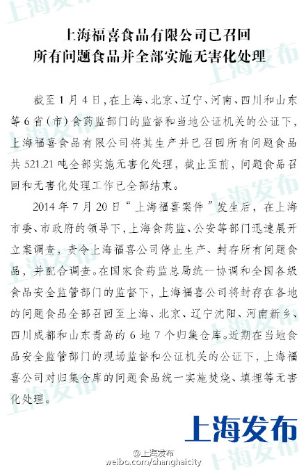人民網(wǎng)北京1月5日電 據(jù)上海市政府新聞辦公室官方微博消息,上海市食品藥品監(jiān)督管理局表示,上海福喜公司將封存在各地的問題食品全部召回至上海、北京、遼寧、河南、四川和山東等6地7個(gè)歸集倉庫。截至昨日,在當(dāng)?shù)厥乘幈O(jiān)和公證機(jī)關(guān)的公證下,福喜將已召回的521.21噸問題食品全部實(shí)施焚燒、填埋等無害化處理。