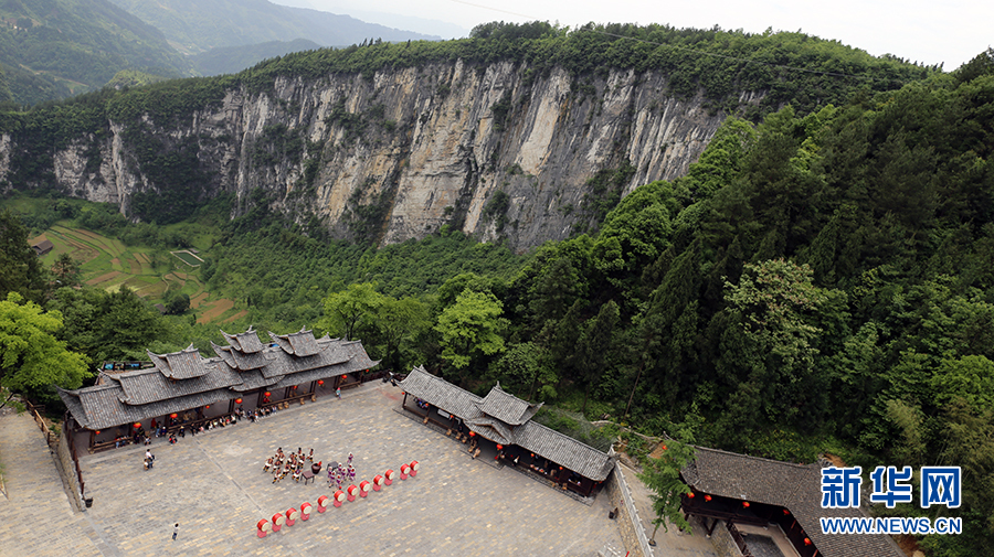 圖為武隆天坑寨子。天坑寨子坐落于武隆世界自然遺產(chǎn)核心區(qū)姊妹天坑中間的絕壁上,寨子兩側就是百余米深的天坑。(飛手:向進攝影:馬天龍)