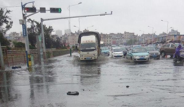 ????5月22日,云南昆明雨后路面積水,汽車濺起水花。
