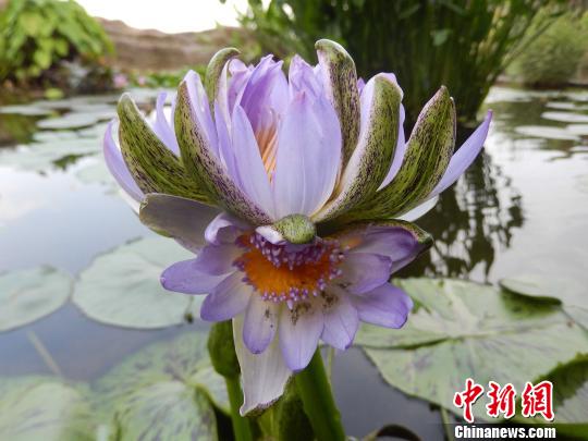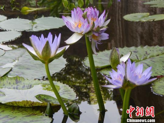 ????該株睡蓮的母本為斑葉藍(lán)睡蓮,是廣州蓮花山景區(qū)工作人員從九品香水蓮之一的“藍(lán)花香水蓮”實(shí)生苗中選育而得。藍(lán)花香水蓮色彩清麗,花型嬌艷,氣味清香,景區(qū)六年前從臺(tái)灣引種了該蓮花。