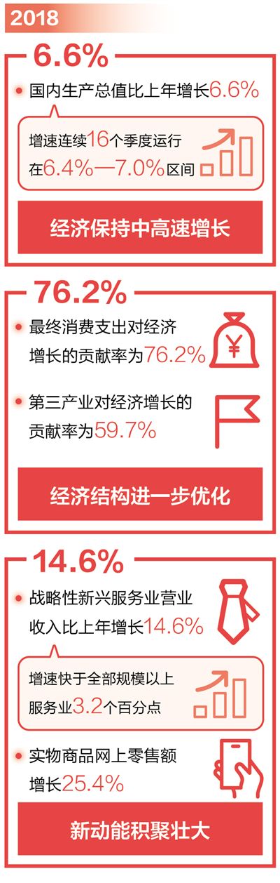 2018年,我國經濟總量站上90萬億元的歷史新臺階,這是自2016年突破70萬億元,2017年突破80萬億元后,中國經濟再次站上新臺階。經濟運行實現(xiàn)總體平穩(wěn)、穩(wěn)中有進,供給側結構性改革深入推進、經濟結構進一步優(yōu)化,創(chuàng)新驅動加快實施、新動能成長蹄疾步穩(wěn)。
