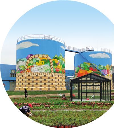 “百蔬園”戶外東側(cè)有兩座由功能性儲能罐改造而成的藝術(shù)建筑,由中央美院的藝術(shù)家團隊歷時3個月設(shè)計、十幾人純手繪完成。巧妙將罐體變?yōu)椴嘶@,加上手繪蔬菜,塑造出一組3D立體菜籃的大地藝術(shù)景觀效果,是“百蔬園”最佳拍照打卡地之一。