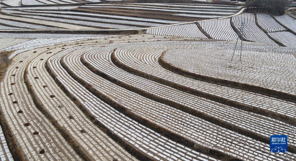 甘肅省定西市安定區(qū)香泉鎮(zhèn)覆地膜后的梯田(3月28日攝,無人機照片)。新華社發(fā)(王克賢 攝)