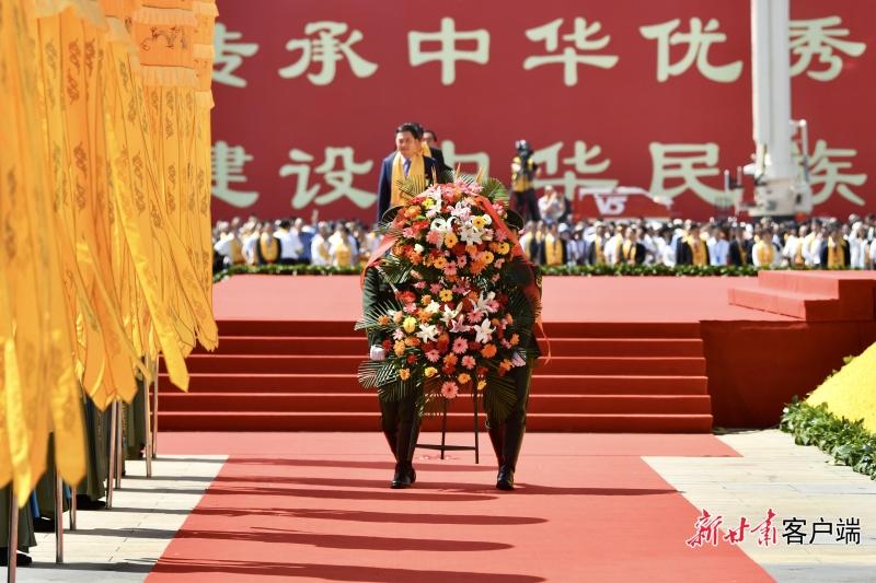 樂舞告祭儀式之后,出席2023年公祭伏羲大典的嘉賓緩緩步入伏羲廟,敬獻(xiàn)花籃,行鞠躬禮。