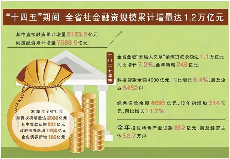 融資渠道結(jié)構(gòu)持續(xù)優(yōu)化,直接融資貢獻(xiàn)度顯著提升。據(jù)介紹,2025年全省社會融資規(guī)模增量達(dá)2086億元,其中貸款新增831億元,政府債券新增1208億元,企業(yè)債券新增165億元。作為“十四五”規(guī)劃收官之年,全省直接融資增量表現(xiàn)突出,包括政府債券、企業(yè)債券及非金融企業(yè)境內(nèi)股票融資在內(nèi)的直接融資增量達(dá)1379億元,占社會融資規(guī)模增量的66.1%,較2024年提高30個百分點,成為實體經(jīng)濟融資的重要補充?!笆奈濉逼陂g,全省社會融資規(guī)模累計增量達(dá)1.2萬億元,其中直接融資累計增量5153.2億元,間接融資累計增量7688.5億元,直接融資與間接融資比例不斷優(yōu)化,金融產(chǎn)品服務(wù)供給更契合實體經(jīng)濟多元化需求。