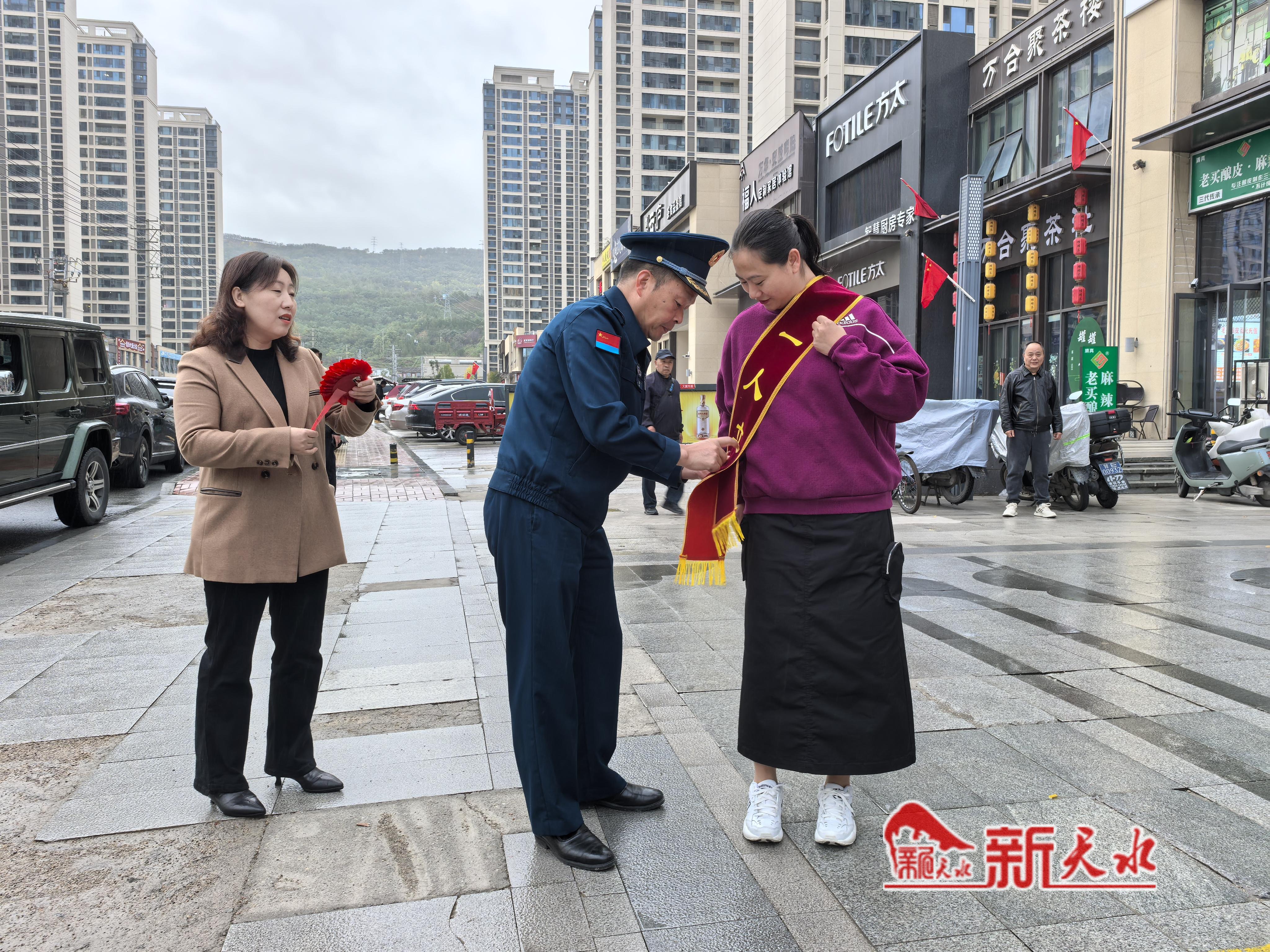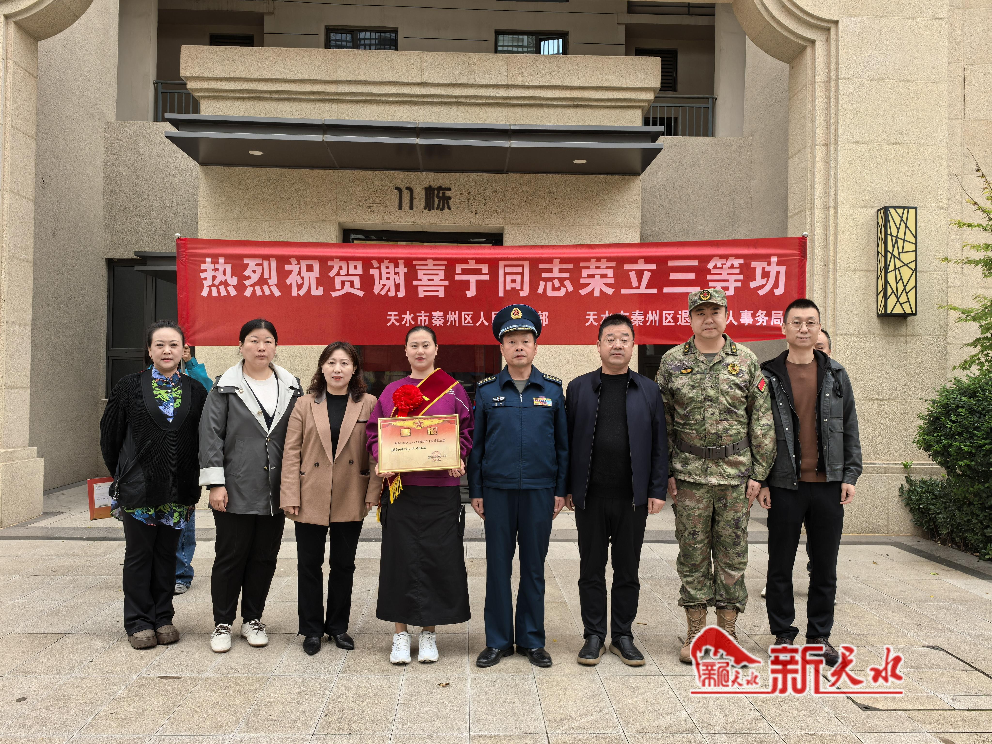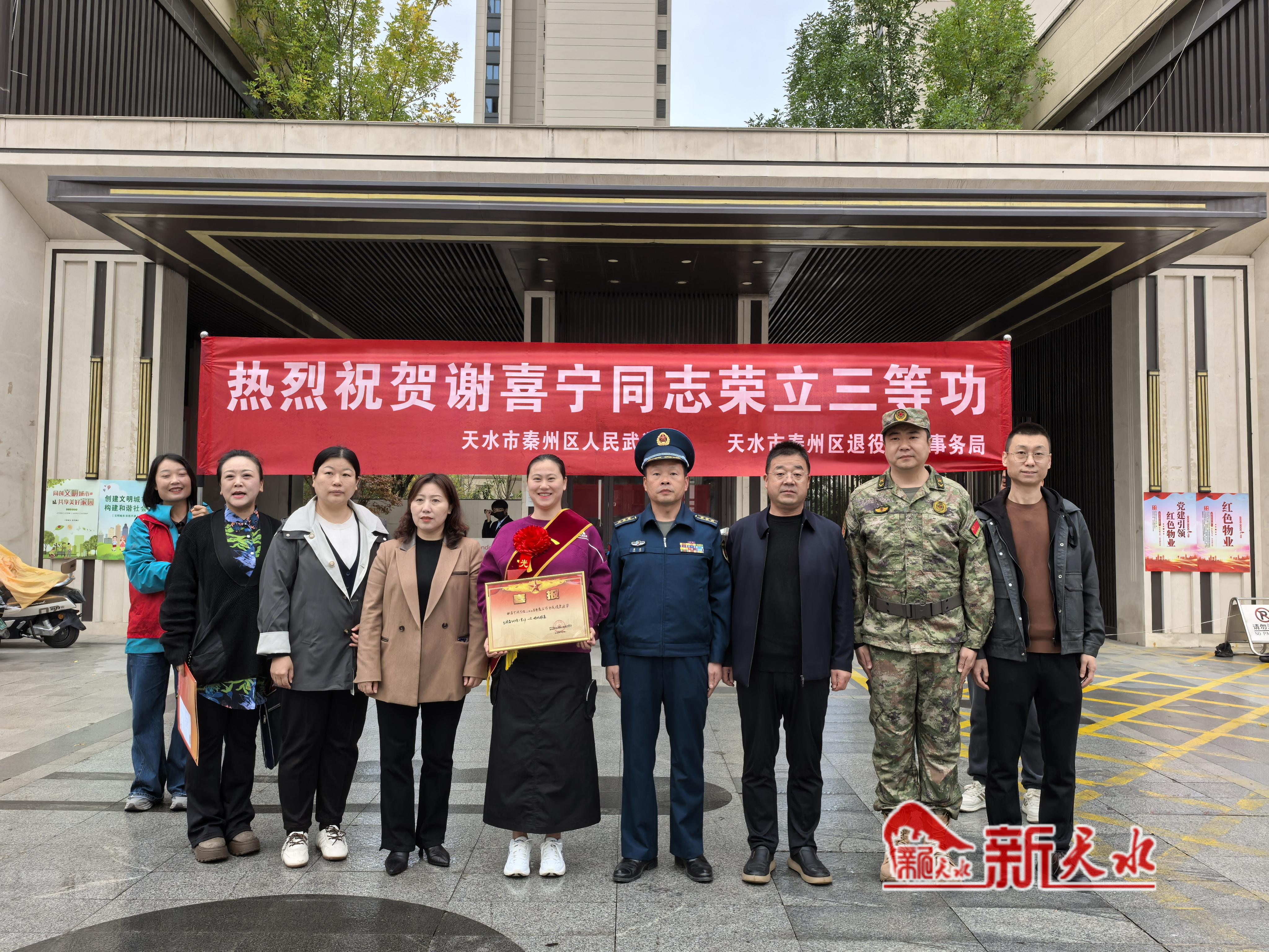 新天水訊【天水融媒記者王瑩】10月16日,雖然天空飄著濛濛細雨,但秦州區(qū)萬達·天御小區(qū)內(nèi)暖意融融,秦州區(qū)人武部和區(qū)退役軍人事務(wù)局領(lǐng)導將邊防軍人謝喜寧第四次榮立三等功的喜報送到了軍嫂何琪手中,為她披上“一人立功 全家光榮”的大紅綬帶,現(xiàn)場的親屬四鄰見狀紛紛鼓掌表示祝賀。