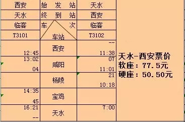 “天水號”城際列車是市委市政府與蘭州鐵路局共同合作打造的跨省城際旅游列車,采用了較為先進(jìn)的25DT型車體,編組6輛。該次列車從天水站始發(fā)時間為7時整,途經(jīng)楊陵、咸陽,當(dāng)日11時38分到達(dá)西安,全程運(yùn)行4小時38分。西安站發(fā)車時間為12時45分,途經(jīng)咸陽、寶雞,當(dāng)日16時21分到達(dá)天水站,全程運(yùn)行3小時36分。列車全程票價:軟座77.50元,硬座50.50元。