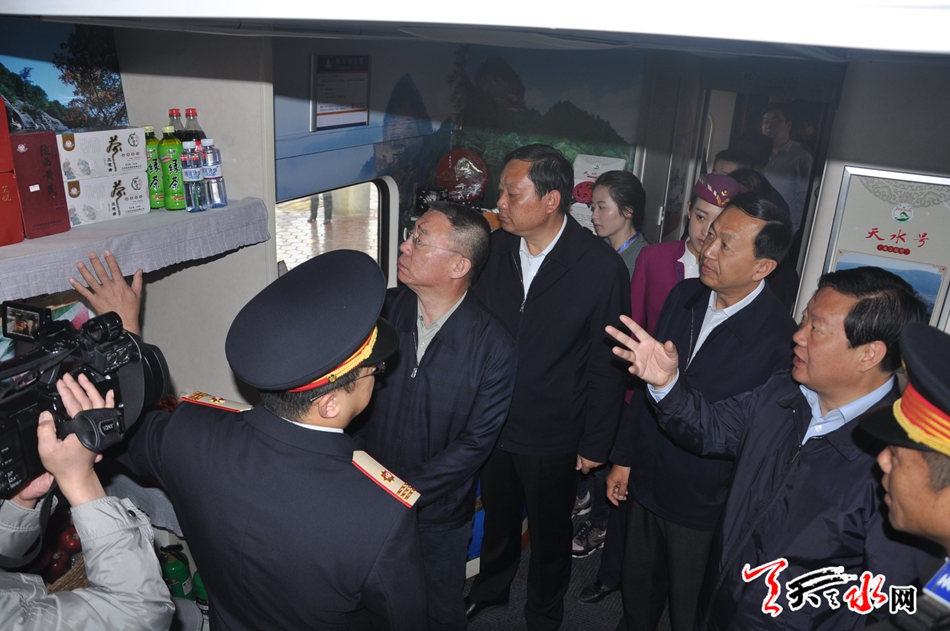 楊維俊在首發(fā)儀式上講話,他說,“天水號”城際列車的開行是我市貫徹落實“一帶一路”發(fā)展戰(zhàn)略、加快“關(guān)中—天水經(jīng)濟(jì)區(qū)”建設(shè)的一項重要舉措,也是全市廣大群眾熱切期盼的一件民生實事。希望全市各級有關(guān)部門和旅游行業(yè)要以此為契機(jī),加大文化旅游宣傳推進(jìn)力度,加強(qiáng)與關(guān)中地區(qū)的文化交流和旅游合作,不斷提升我市文化旅游業(yè)的品牌影響力和整體發(fā)展水平。同時,希望蘭州鐵路局繼續(xù)加強(qiáng)指導(dǎo)支持,天水火車站精心組織管理,地方政府做好協(xié)調(diào)配合,確保列車安全、高效運(yùn)行,真正把這趟列車打造成宣傳天水、展示天水的重要窗口。