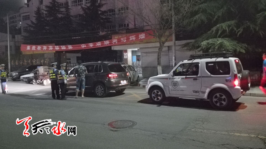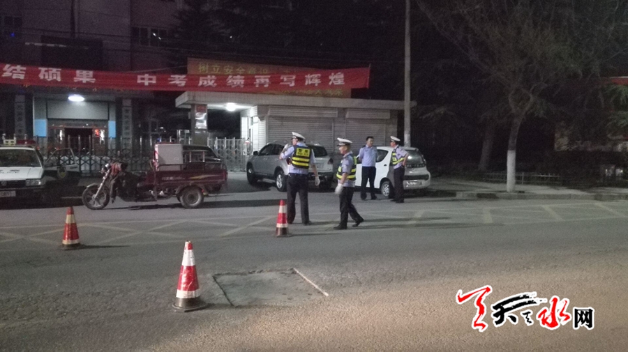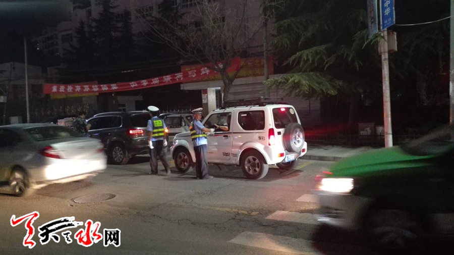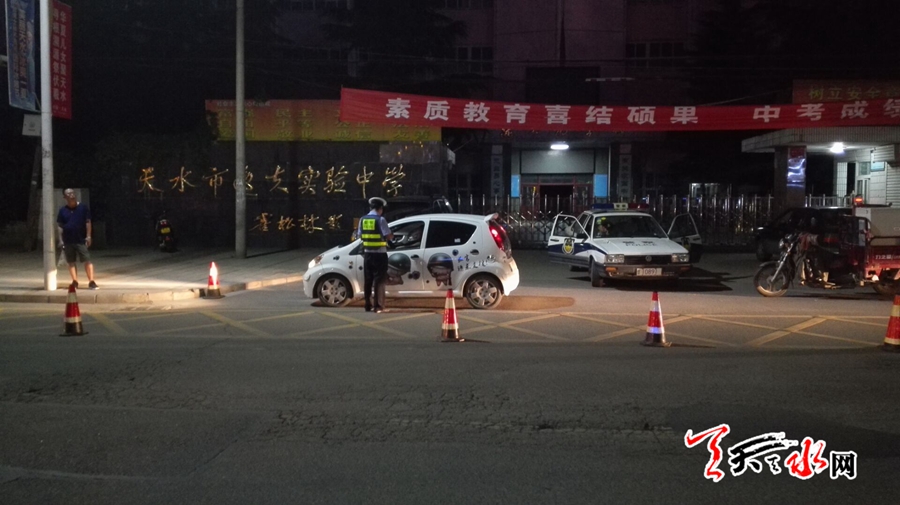 天天天水網(wǎng)20日22時(shí)訊(記者蘇中豹)20晚間,在位于秦州區(qū)天水湖畔逸夫中學(xué)門(mén)前,交警正夜查車(chē)輛。
