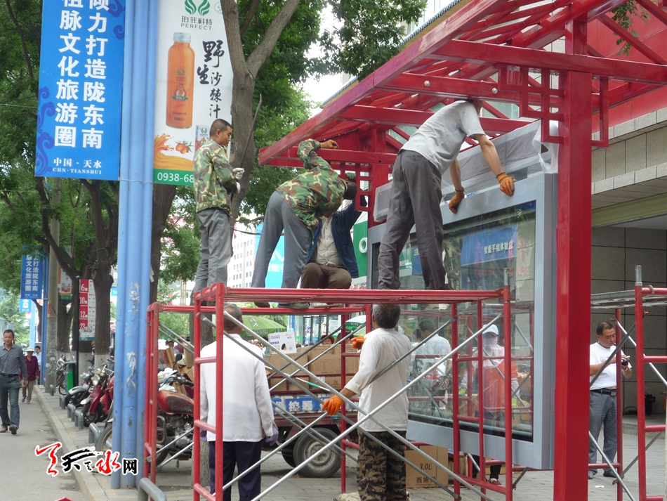 天天天水網(wǎng)訊【記者蔚軍平】7月25日下午,在秦州區(qū)大眾北路,施工人員正在安裝智能公交站亭。自2015年我市實(shí)施公交??空局悄芑脑祉?xiàng)目以來,至今年7月已改造建成180座,力爭后半年再改造120座,直至2017年完成總數(shù)為500座的改造任務(wù),讓更多的市民分享到公交停靠站智能化改造所帶來的多功能服務(wù)的便民成果。