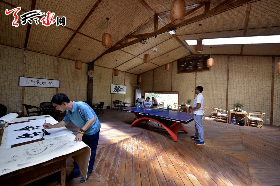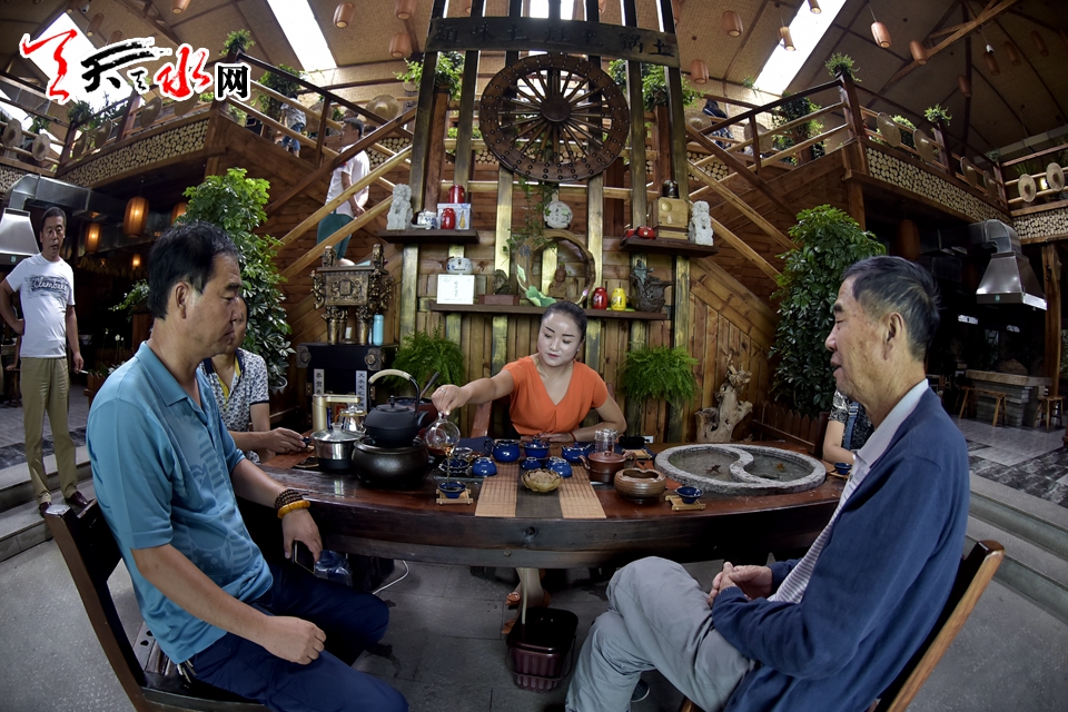 游客在森泰田園土灶農(nóng)家樂品茶