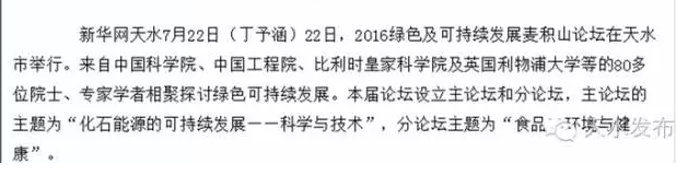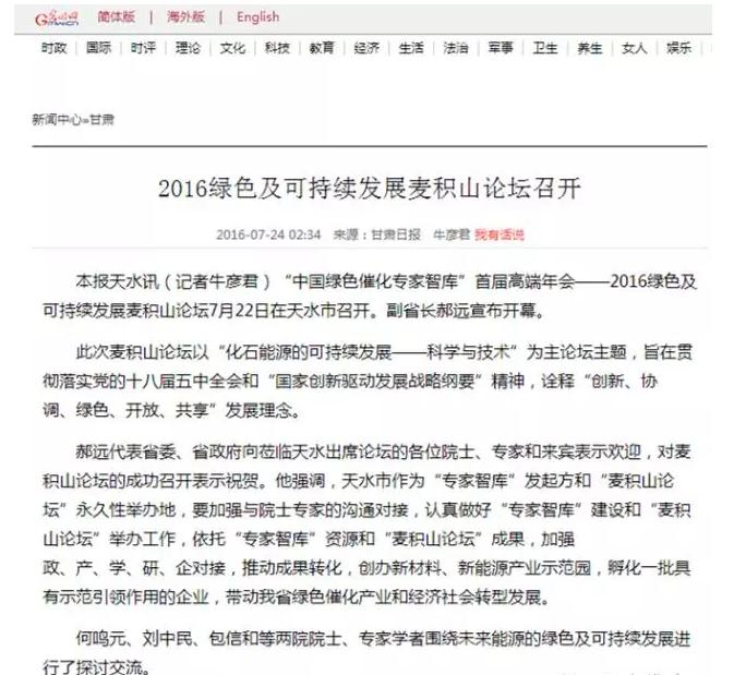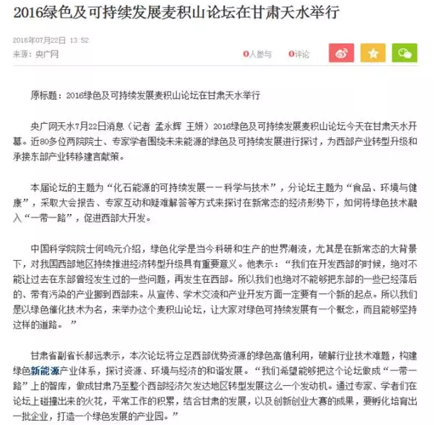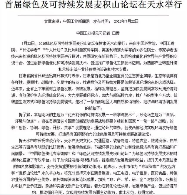 7月22日、23日,?2016綠色及可持續(xù)發(fā)展麥積山論壇在天水舉辦。80多位兩院院士、專家學者圍繞未來能源的綠色及可持續(xù)發(fā)展進行探討,為西部產(chǎn)業(yè)轉型升級和承接東部產(chǎn)業(yè)轉移建言獻策。人民網(wǎng)、新華網(wǎng)、中國工業(yè)新聞網(wǎng)、光明網(wǎng)、鳳凰網(wǎng)、大公網(wǎng)、搜狐、網(wǎng)易、甘肅電視臺、中國甘肅網(wǎng)、每日甘肅網(wǎng)等多家中央、省內外媒體聚焦天水,來看這些媒體都是怎么報道的?