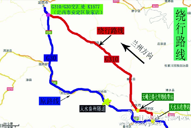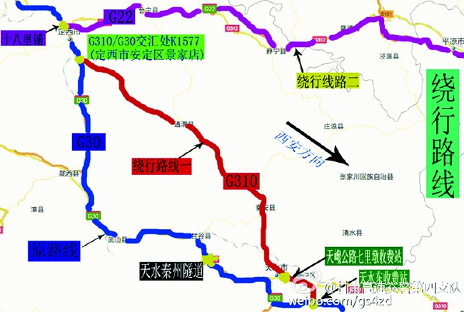 分流道路:(一)在定西十八里鋪和景家店設立分流點,將秦州隧道下行線(蘭州至天水方向)管制車輛分流至青蘭高速和國道310線(天巉公路)通行。(二)在天水甘泉設立分流點,將秦州隧道上行線(天水至蘭州方向)管制車輛分流至國道310線(天巉公路)通行。(三)在天水南收費站設立分流點,將十天高速經秦州隧道去往蘭州方向的管制車輛,分流至羲皇大道、飛機場立交橋、天北高速至天巉公路通行。