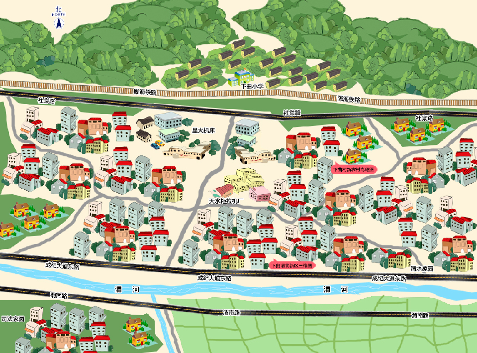 一張設(shè)計精美的卡通電子地圖,呈現(xiàn)給觀眾的不僅是一張簡單的方位圖片,帶給你驚喜的是這張立體卡通地圖中有序地將秀美村莊縮略在其中,鄉(xiāng)村道路指向,鄉(xiāng)村建設(shè)布局,更有趣的是,鄉(xiāng)村中主要景觀和農(nóng)家樂等將在這張卡通地圖中以720VR三維動態(tài)全景圖的新媒形態(tài)出現(xiàn)。