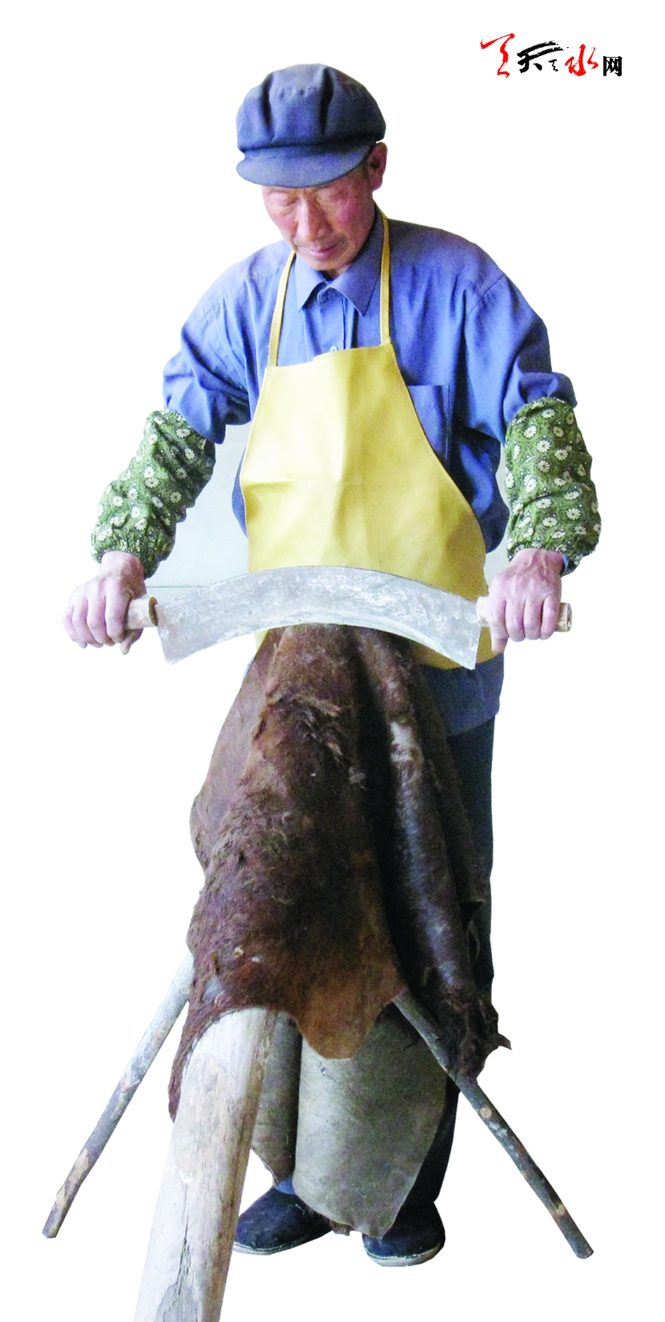 ▲用鏟刀刮皮革上的肉屑油渣