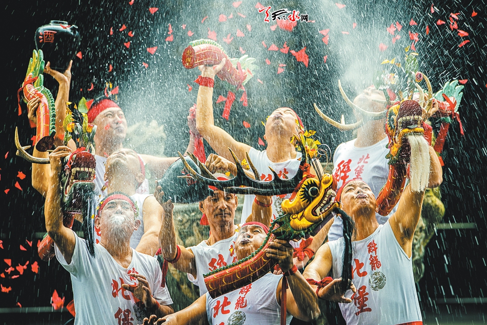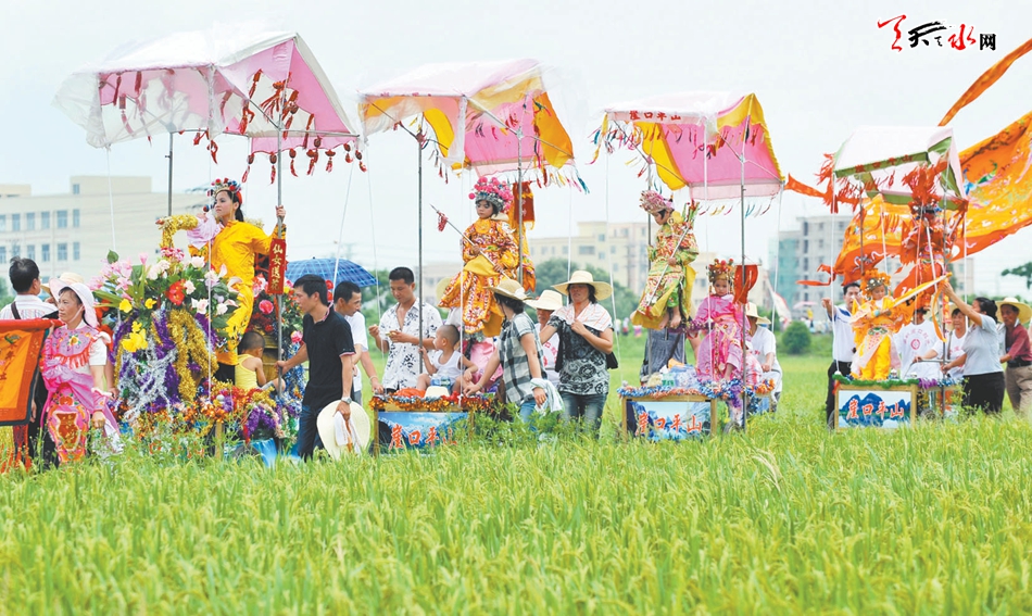 ▲農(nóng)歷“龍王誕”,男女老少組成飄色隊伍巡游。