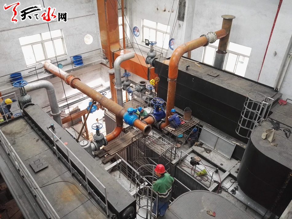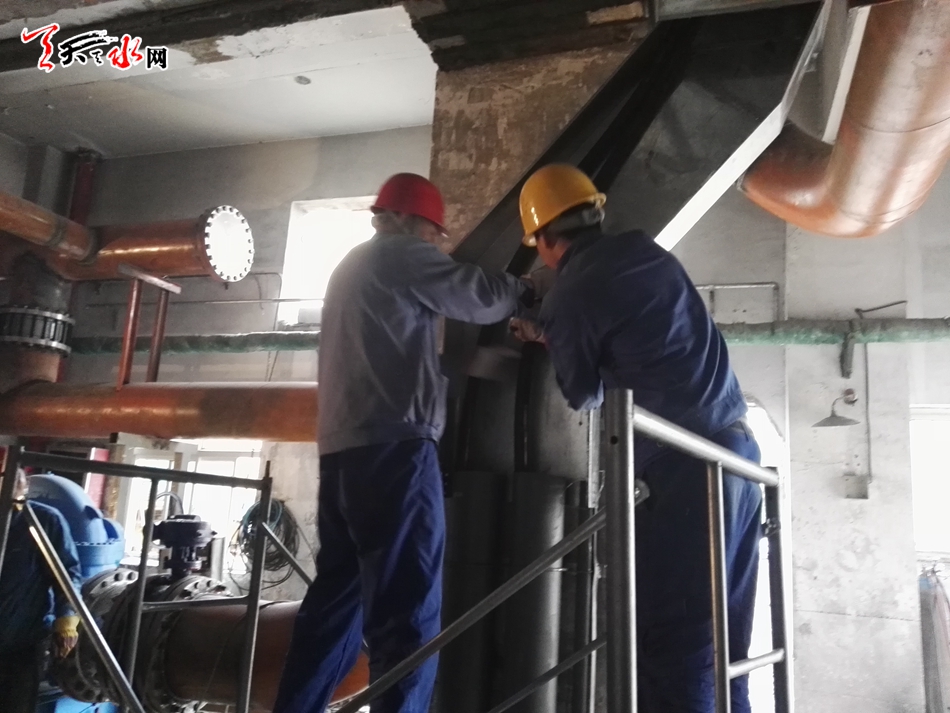 ▲10月21日,工人正在東關(guān)供熱站緊張地施工。為保證今冬如期供暖,他們加班加點(diǎn)安裝設(shè)備、焊接供回管道。