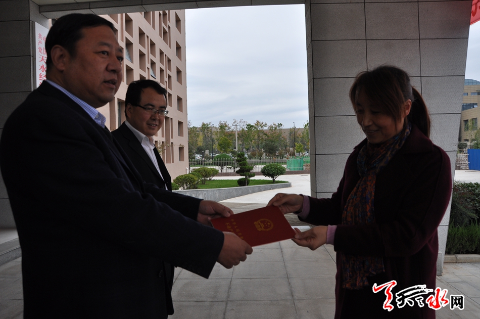 天天天水網(wǎng)25日18時(shí)訊 【記者 邵蘭霞】10月25下午,天水經(jīng)濟(jì)開發(fā)區(qū)為開發(fā)區(qū)轄區(qū)企業(yè)長(zhǎng)城電工天水物流有限公司、天水市中西醫(yī)結(jié)合醫(yī)院、甘肅隴鼎建設(shè)工程公司等單位頒發(fā)了首批不動(dòng)產(chǎn)權(quán)證書。這標(biāo)志著開發(fā)區(qū)結(jié)束了土地、房產(chǎn)等不動(dòng)產(chǎn)分散登記的歷史,不動(dòng)產(chǎn)登記工作進(jìn)入全面明晰產(chǎn)權(quán)、有效保護(hù)權(quán)益、維護(hù)交易安全、提高服務(wù)效率的嶄新階段。