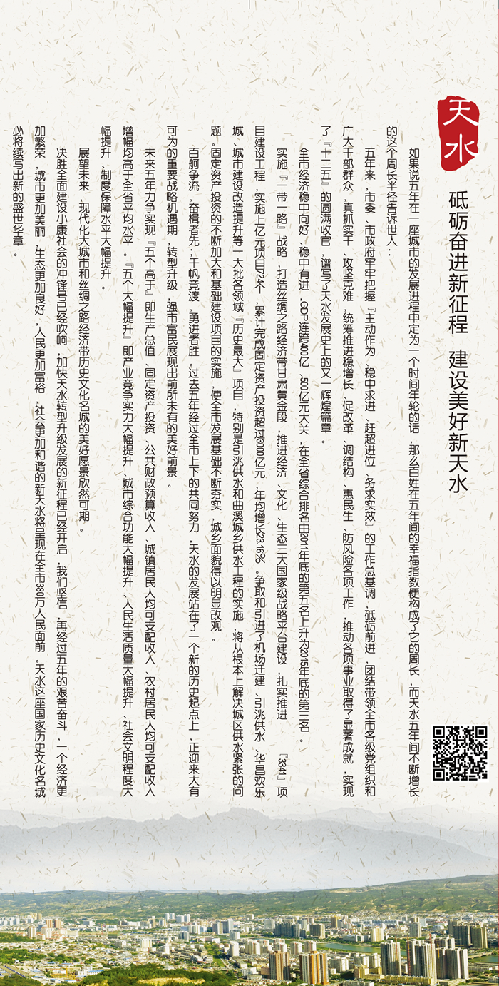 我們渴望這本小小的特刊,能夠盡可能準確的描繪未來五年天水發(fā)展的藍圖。