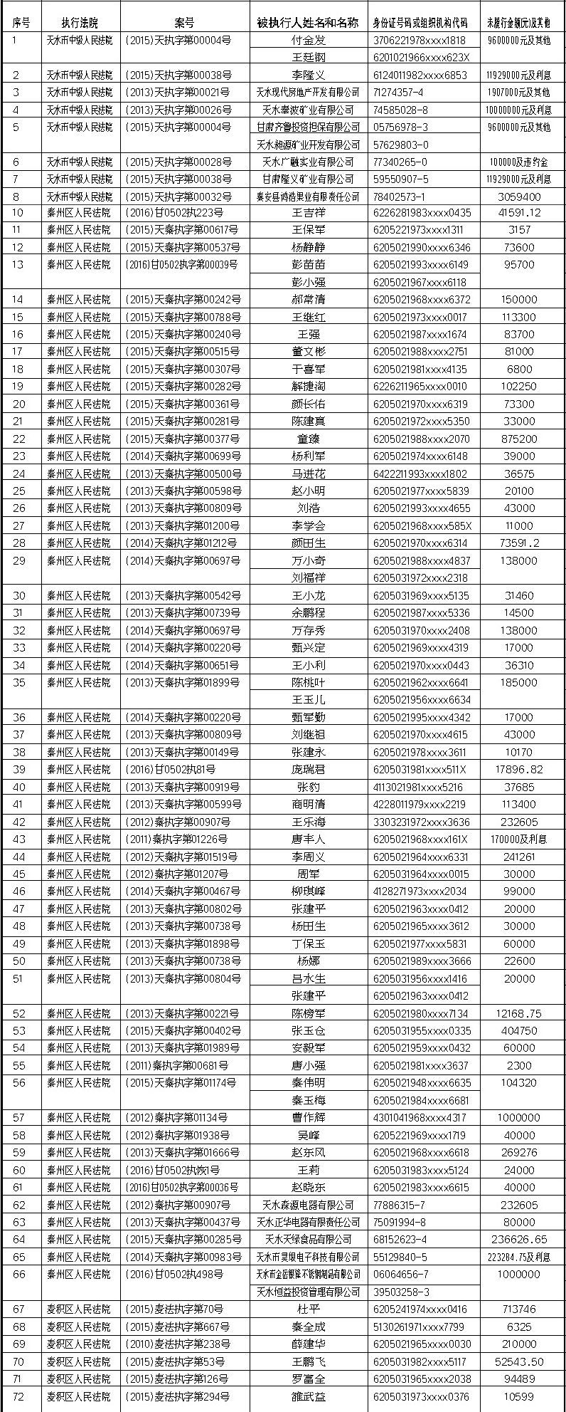 天水市中級(jí)人民法院關(guān)于公布失信被執(zhí)行人名單的公告