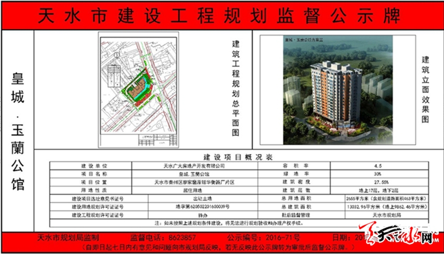 皇城·玉蘭公館住宅項(xiàng)目位于天水市秦州區(qū)廖家磨原鍇華衡器廠片區(qū),是由天水廣大房地產(chǎn)開(kāi)發(fā)有限公司開(kāi)發(fā)建設(shè)的層高為地上17層、地下2層的一棟住宅樓。項(xiàng)目總用地面積2655平方米(約合4畝),總建筑面積1.3萬(wàn)平方米(地上建筑面積9862.46平方米),容積率4.5,綠地率30%、建筑密度27.55%。