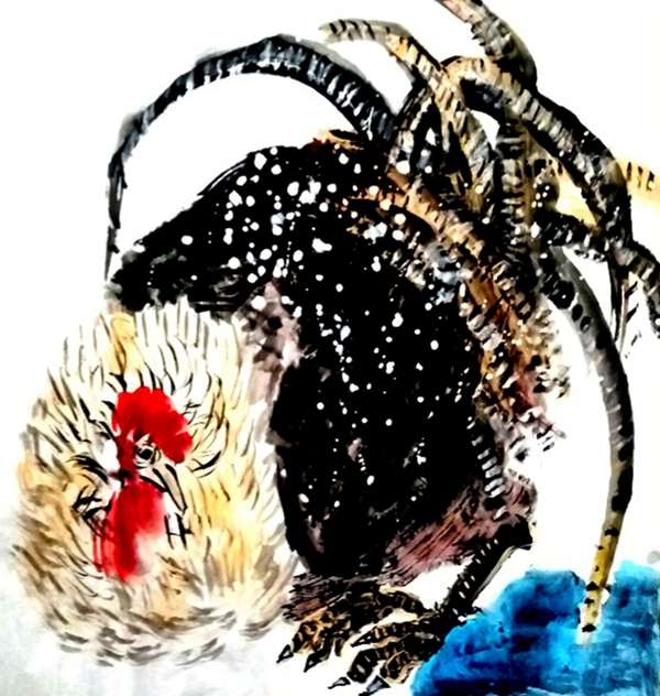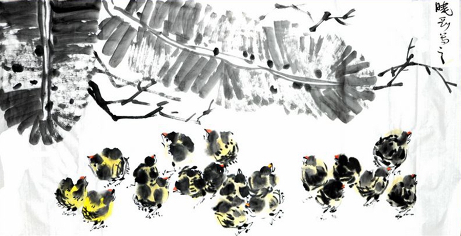 我其實(shí)最喜歡丁曉剛先生畫的小雞,他畫小雞時(shí),那一墨一色之間一群小雞神態(tài)各異,只聽得筆落紙上的時(shí)候 ,一只只小雞活靈活現(xiàn)的出現(xiàn)了。丁曉剛先生是我見過的畫家中畫小雞最為傳神的畫家, 一個(gè)個(gè)沒有重復(fù)的神態(tài)。我不知道如何評(píng)價(jià)他畫的小雞,我做為一個(gè)普通的欣賞者的確有點(diǎn)愛不釋手。丁曉剛先生的小雞為何畫的這么好,這與其長期在農(nóng)村采訪有關(guān),采訪之后,他經(jīng)常在農(nóng)家小院里拿出采訪本,對(duì)著小雞寫生畫速寫,這樣日積月累,便對(duì)小雞的動(dòng)態(tài)線條掌握的非常的準(zhǔn)確。