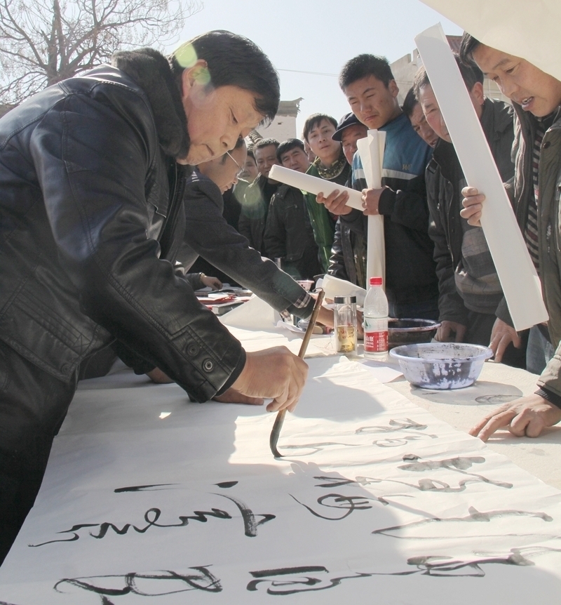 2013年,天水市的“雙聯(lián)”工作在市委的領(lǐng)導(dǎo)下進(jìn)行的如火如荼,丁曉剛老師在深入采訪中來到甘谷縣盤安鎮(zhèn)田家山村、秦安縣蓮花鎮(zhèn)槐龍村、清水縣永清鎮(zhèn)張揚(yáng)村、武山縣馬力鎮(zhèn)北順村、苗豐村、張家川縣張川鎮(zhèn)孟寺村、秦州區(qū)天水鎮(zhèn)柴家山村、麥積區(qū)花牛鎮(zhèn)紙硯村。在這里,他一面做深入的新聞?wù){(diào)查,一面給農(nóng)民送上幅幅書畫作品,當(dāng)?shù)弥ㄅf?zhèn)紙硯村的李芳芳在“雙聯(lián)”中受益,家中蓋了一院新房子時(shí),丁曉剛老師采訪結(jié)束回到家中便為其書寫了中堂對(duì)字,寄給了李芳芳,當(dāng)看到柴家山村農(nóng)家中還掛著文革時(shí)宣傳畫時(shí),丁曉剛老師為其寫了一幅橫幅,農(nóng)民感激的流淚。當(dāng)?shù)弥表槾搴兔缲S村的農(nóng)民都修起了新房子,而家中墻上空空如也時(shí),丁曉剛老師不辭長時(shí)間采訪的累,為農(nóng)民書寫到傍晚。在北順村,丁曉剛老師還為全村的雙聯(lián)工作賦詩一首書寫之:秦州四月杏花開,驅(qū)車百里問百順,藍(lán)天之下馬力人,笑說“雙聯(lián)”果子紅。這首詩被村委會(huì)裝裱后懸掛在農(nóng)家書屋內(nèi),成了村民文化的標(biāo)桿。