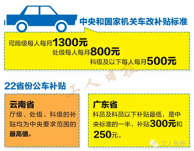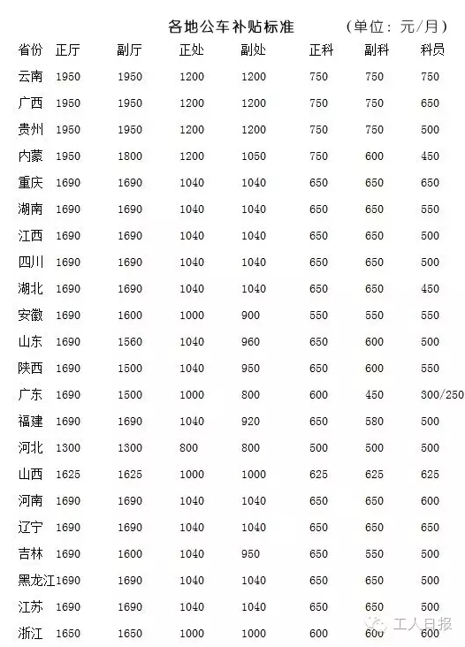 從目前公布的22地公車補貼來看,云南、廣西、貴州均是補貼“頂格”,是司局級1300元標準的150%。值得一提的是云南省,廳級、處級、科級的補貼均為中央要求范圍的最高值。
