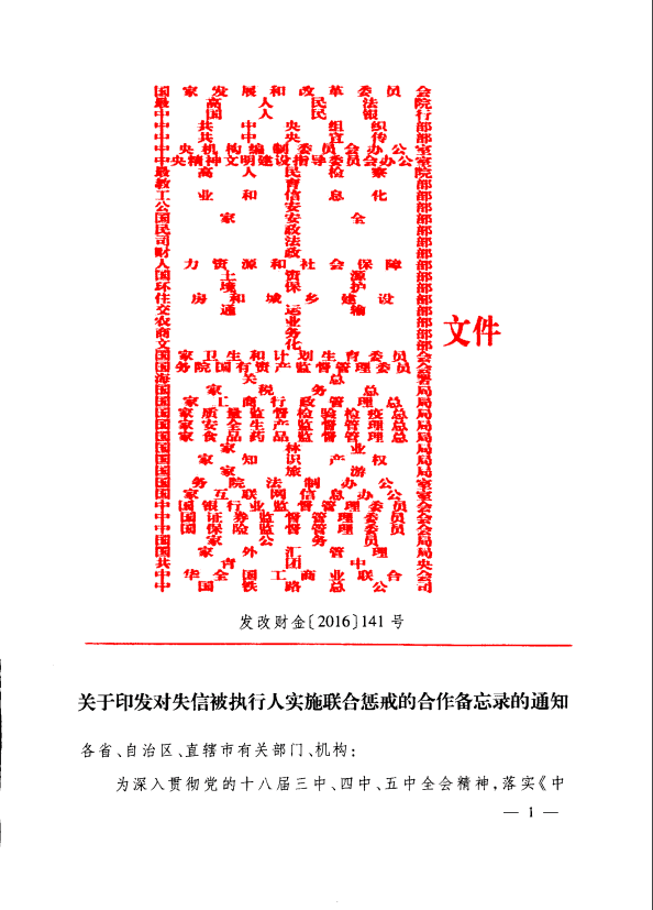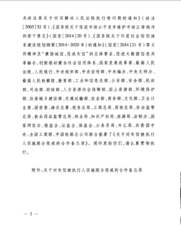 《關(guān)于印發(fā)對(duì)失信被執(zhí)行人實(shí)施聯(lián)合懲戒的合作備忘錄的通知》(下稱《備忘錄》)