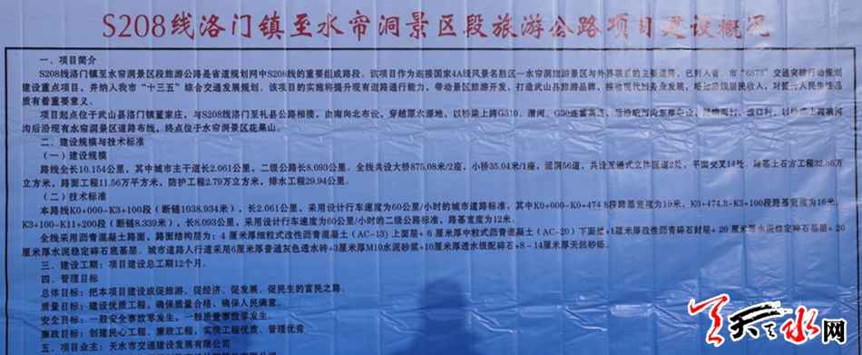 據(jù)了解,洛門鎮(zhèn)至水簾洞景區(qū)段旅游公路是天水市旅游公路建設(shè)的標(biāo)志性項(xiàng)目,也是列入全市"6873"交通突破行動的重大項(xiàng)目。該項(xiàng)目總投資2.4億元,總里程10.154公里,其中城市主干道2.016公里、二級公路長8.093公里,項(xiàng)目起點(diǎn)位于武山縣洛門鎮(zhèn)董家莊村,接洛門至禮縣二級公路,途徑塔麻村、響河村、改口村至終點(diǎn)水簾洞景區(qū)。起點(diǎn)至塔麻村采用城市主干道建設(shè)標(biāo)準(zhǔn),設(shè)計(jì)時速60公里,路基寬度分別為19米、16米,塔麻村至終點(diǎn)水簾洞景區(qū)采用二級公路標(biāo)準(zhǔn)建設(shè),設(shè)計(jì)時速60公里,路基寬12米。項(xiàng)目采用總承包模式建設(shè),由中交第一公路工程局有限公司負(fù)責(zé)建設(shè)。